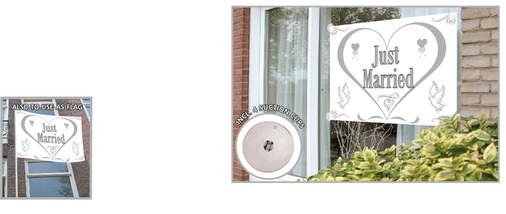 Just merried banner med 4 sugproppar som gör den enkel att sätta upp.