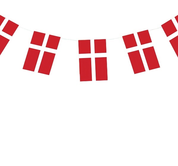 En lång girlang med danska flaggor, perfekt att dekorera med då det ska firas ordentligt.